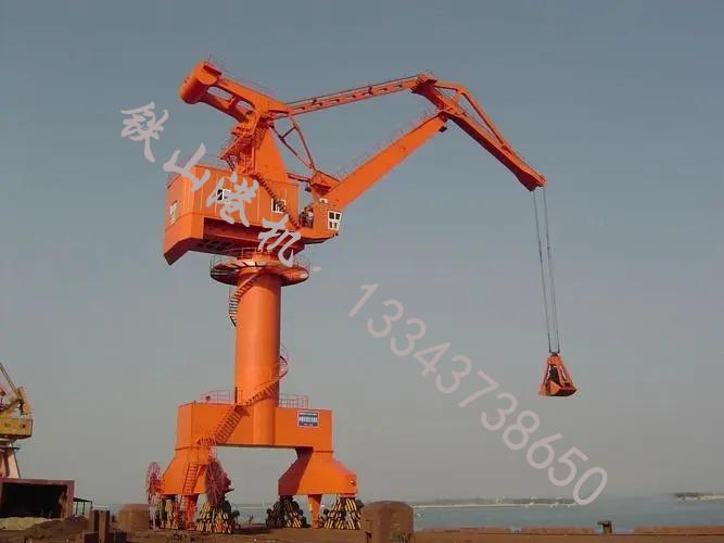 安徽亳州門座式起重機生產廠家門座起重機有起升、回轉、變幅和運行機構,前3種機構裝在轉動部分上,每一周期內都參加作業(yè)。轉動部分上還裝有可俯仰的傾斜單臂架或組合臂架及司機室。運行機構裝在門座下部,用以調整起重機的工作位置帶斗門座起重機,還裝有伸縮漏斗、帶式輸送機等附加設備,以提高門座起重機用抓斗裝卸散狀物料時的生產率。除電氣保護裝置外,還裝有起重量或起重力矩限制器、起重機夾軌器等安全裝置。